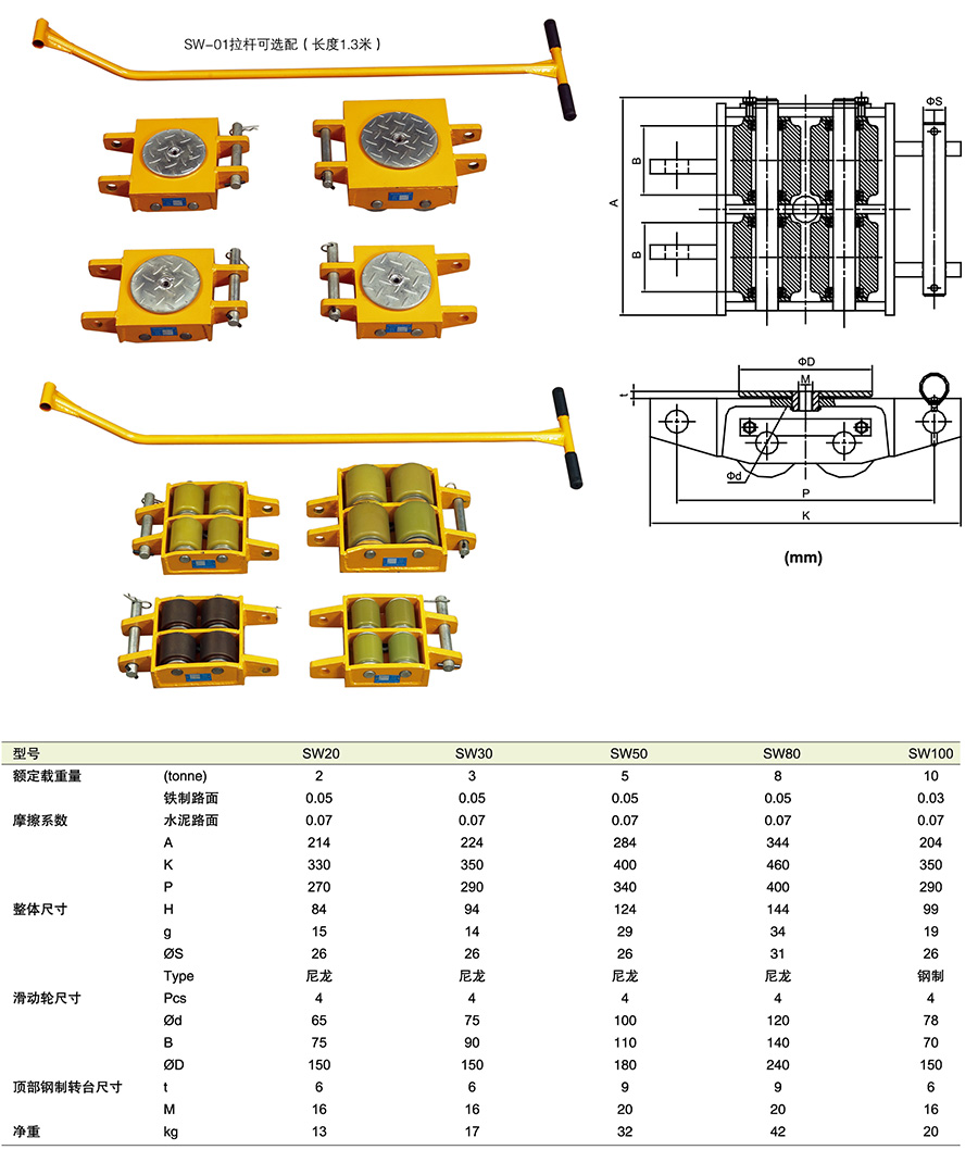 ● 與撬棒或千斤頂配合使用,可用于重型貨物的搬運(yùn)。大直徑尼龍輪(10噸型號(hào)配備鋼輪)幫助搬運(yùn)省力,保護(hù)地面以防受損。